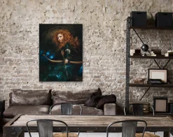 Princess Merida is her own woman. Intent to be unbound by tradition, she wields her bow, a gift from her father, and appears calmly determined to follow the path toward her own fate. Depicted here in Heather Edwards’ masterful painting, Merida is poised, powerful and filled with resolve to be the person she knows she was born to be.