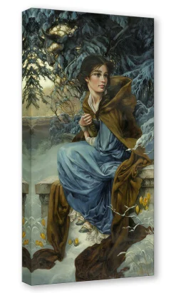 Beauty can emerge from the most unexpected places. This enduring theme from the classic tale of Beauty and the Beast is beautifully hinted at in this sensational portrait of Belle by artist Heather Theurer. In this composition, we see that even in the cold chill of winter, bright yellow poppies can be seen pushing through the snow at Belle’s feet to show that even under the harshest of conditions, beauty and love can survive. Look closer: Can you find the subtle image of Beast in the branches of the tree behind her?