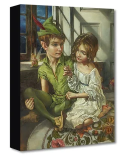 This tender moment between Peter and Wendy, as she sews his unruly shadow to his feet, is masterfully recreated by fine art painter Heather Edwards. The emotional significance of this exchange has been a topic of discussion among fans of this story for many years. Perhaps Peter’s shadow is a symbol, if not the very essence, of a mortal person who is capable of love and enduring human connection. Maybe this is what Peter is truly seeking as he playfully chases after his own shadow and Wendy’s love for him is ultimately what connects him to reality.