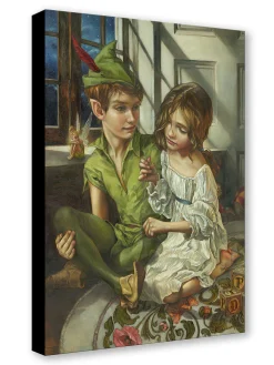 This tender moment between Peter and Wendy, as she sews his unruly shadow to his feet, is masterfully recreated by fine art painter Heather Edwards. The emotional significance of this exchange has been a topic of discussion among fans of this story for many years. Perhaps Peter’s shadow is a symbol, if not the very essence, of a mortal person who is capable of love and enduring human connection. Maybe this is what Peter is truly seeking as he playfully chases after his own shadow and Wendy’s love for him is ultimately what connects him to reality.