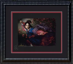 “The flower that blooms in adversity is the most rare and beautiful of all.” These wise words spoken by The Emperor in Disney’s Mulan are a profound statement about Mulan’s transformative journey in this classic tale of self discovery. This mesmerizing portrait by fine art painter Heather Edwards, set against a backdrop of blooming Cherry Blossoms, depicts Mulan draped in the traditional clothing that confines her to what others expect her to be, while wielding the sword of the warrior she knows she is inside.