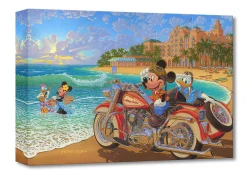 Friends Mickey and Donald take in an extraordinary sunset after a day full of island exploration on Mickey’s custom motorcycle. Minnie and Daisy enjoy the warm water of this idyllic tropical lagoon in this intricately detailed artwork by artist Manuel Hernandez.